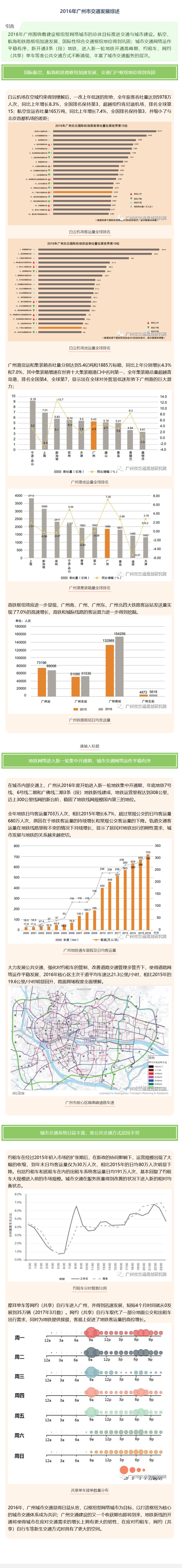 2016年广州围绕着建设枢纽型网络城市的总体目标推进交通与城市建设。航空、航海和铁路枢纽加速发展,国际性综合交通枢纽地位得到巩固;城市交通网络运作平稳有序,新开通3条(段)地铁,进入新一轮地铁开通高峰期,约租车、网约(共享)单车等准公共交通方式不断涌现,丰富了城市交通服务的层次。