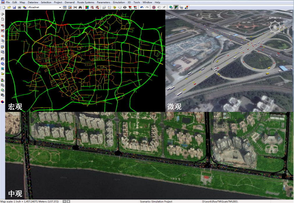 广州市科学技术局立项科研课题,创新实现了一体化交通仿真模型决策支持技术,突破了现有仿真中仅单独使用某一种仿真模型的瓶颈,使得同一个平台中,宏观、中观或微观仿真模型既可以单独使用,又可以同时使用。一体化交通仿真模型在交通组织优化评估、交通管理政策研究以及信号控制优化评估等多个项目中应用,发挥了可量化、可视化的重要作用。