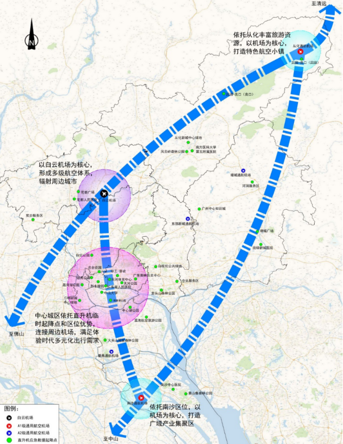 首次开展面向城市规划主管部门的通用航空机场选址规划,提出2个A1级通用航空机场、3个A2级通用航空机场和32个直升机临时起降点的选址方案,针对独立用地通用航空机场(A1、A2级)和兼容用地的直升机临时起降点分别优化用地控制指标,控制独立用地面积达到513.9万m2,创新性地提出和城市空间紧密结合的通用航空机场选址流程、通用航空机场用地控制指标体系,为我国大城市开展通用航空机场选址规划提供借鉴。规划成果能有效支持城市规划主管部门提出通用机场的选址意见,对于完善广州市的航空运输体系,构建国际航空枢纽起到重要的支撑作用。