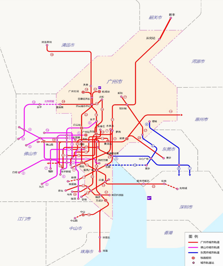 推动轨道交通周边区域城市一体化规划,打造 “一张网、一张票、一串城”。坚持“时空约束、中心直连、枢纽共享、边界融合、资源共享”五大规划理念,构建层次匹配、功能明确的通道体系,规划形成“广佛一张网、穗莞多通道、其他城市中心直达”的一体化都市圈轨道网络,方案形成广州与周边8座城市间共计28条城市轨道,并提出跨市轨道规划、建设、运营、管理一体化新模式。
