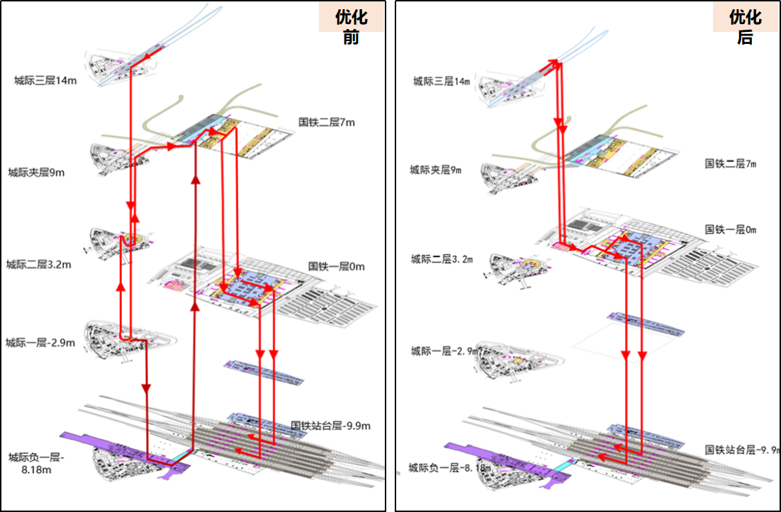 借鉴同类经验,研究提升新塘站功能定位,对新塘站综合交通枢纽一体化工程枢纽配套场站工程开展交通专项研究,系统梳理并完善周边集疏运路网体系及节点方案,打造集便捷性、舒适性和人性化为一体的世界级交通枢纽。方案秉持“空间共享、设施共用、高效换乘”的理念,增设换乘大厅及穗莞深城际北站厅,实现国铁、城际、地铁之间的“零换乘” 免安检换乘,换乘距离缩短至150m,换乘时间控制在3分钟左右,换乘效率显著提升。