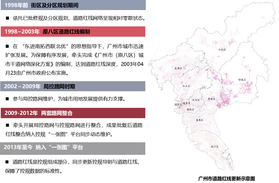 自2000年以来,我院已持续23年负责广州市控规道路红线的动态维护,参与广州市道路红线数据标准的制定,负责控规红线数据的核查制作、汇总入库工作,做好道路红线总网更新的台账,确保控规道路红线数据的权威性、时效性和准确性,为道路规划查询、历史溯源、规划审批等日常工作提供高效、高质量的技术支持。