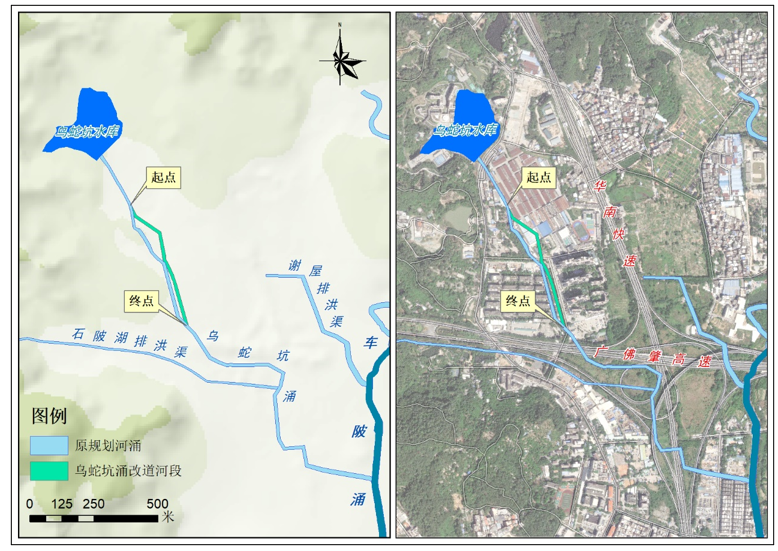 为推动城市高质量发展,增强规划地块的整体性,提高河涌周边地块的土地利用率,降低区域洪涝风险,构筑城市水安全韧性基底,落实“两个坚持、三个转变”的防灾减灾救灾新理念,根据河涌改道原则、地形特征、排水走向及控规方案,对乌蛇坑涌进行水系优化调整。调整后的乌蛇坑涌更为顺直,且河道洪水位降低,过水断面面积、水面面积增大,有利于河道泄洪和河势稳定。
