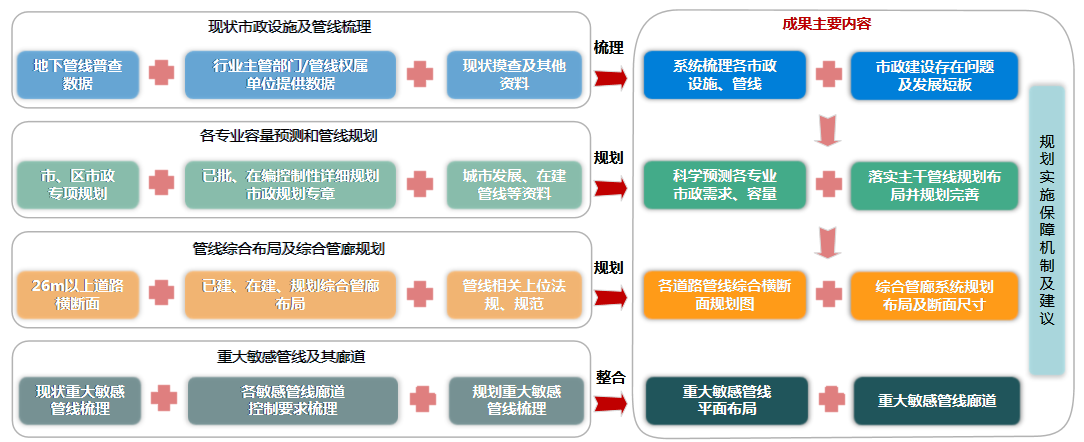 内容涵盖给水、污水、雨水、电力、通信、燃气、重大敏感管线及管线综合(含综合管廊)的规划。各专业管线及综合管廊规划总长约34170公里,制定各路段管综横断面建议方案共3621图幅,梳理整合重大敏感管线及廊道约284公里。规划成果可随控制性详细规划编制逐步纳入市政专章,作为控制性详细规划法定文件之一,以支撑详细规划方案编制,指导片区地下管线的实施建设,还可具体指导管线工程设计及建设工作。