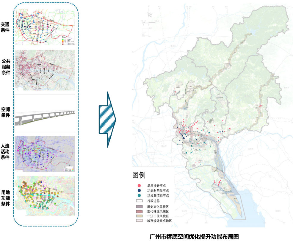 规划以”四个出新出彩“为指导思想,以“绣花功夫”为手段,以实现空间共建共治共享为中心,遵循”一桥一方案“的工作制度,”一桥一景观“的工作思路,打造”一桥一特色“的高品质交通空间。以“空间好用、城市好管、景观好看”为标准,建设“交通有序、活动安全、环境整洁、功能共享”的桥底空间,推动广州实现综合城市功能出新出彩,换发城市新活力。本项目规划成果已经广州市政府批复并印发实施。