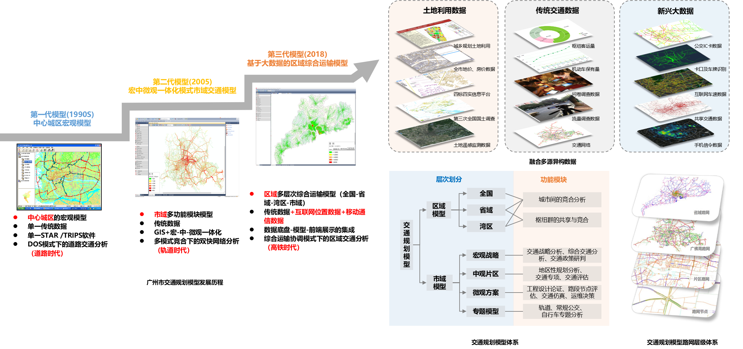 交通模型是城市交通规划的定量分析支撑平台,模型的准确性离不开基础数据和模型参数的定期更新与校核。广州在上世纪80年代建立了第一代交通规划模型,持续30年的更新确保了模型的生命力、准确性和可信性。伴随多轮交通发展战略规划编制,广州综合交通模型不断迭代升级,基于土地利用、传统交通数据和新兴大数据的融合,已形成全国-省域-湾区多层次的区域模型体系和宏中微观与专题模型相结合的市域模型体系。通过持续升级交通规划模型,保障了城市交通系统的高水平运行,为各相关职能部门的科学决策提供量化依据,保障决策分析的准确性和可信性。