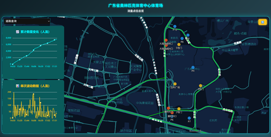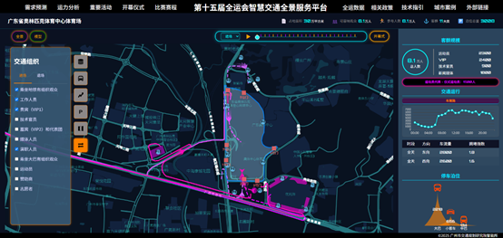 交研院以技术创新为核,以仿真评估为要,开发第十五届全运会交通保障技术支撑平台,推动开幕式交通保障相关工作数字化、集成化、可视化;结合广州市路网模型开展开幕式场馆人车进退场全仿真模拟评估,精准预判潜在风险并优化方案;开发开幕式流量监测统计平台,以数据赋能筑牢现场调研与后评估智慧化根基。