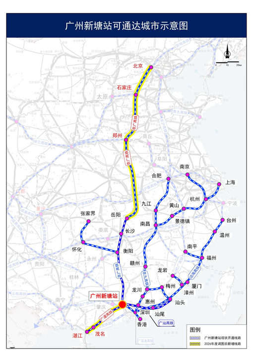 强化对外链接效率,便捷联通国家、省级都市圈。本次调图新增广州新塘站与北京西站周末往返动卧列车1对,途经郑州、石家庄等关键交通节点城市,标志着广州东部中心与首都以及京津冀、中原地区的联动发展迈入高质量新阶段。同时,依托2025年年底建成通车的广湛高铁,广州新塘站将常态化开行往返湛江北的列车18列,实现增城与阳江、茂名、湛江等粤西城市的快速连接。调图前,东部中心旅客需先到广州南站,再从广州南站乘车去往湛江,时长约5小时。调图后,从广州新塘站直达湛江的高铁仅需3小时,节约2小时。