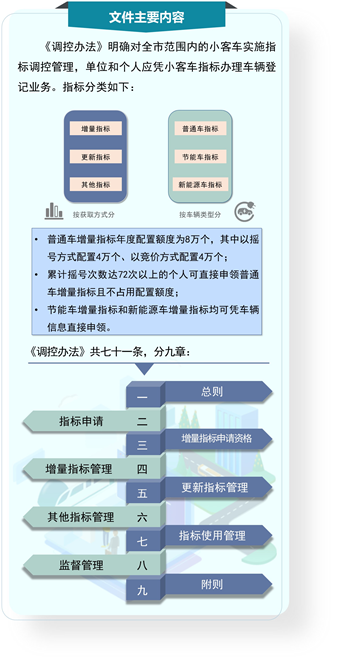 目前,新修订的《调控办法》对多项政策措施进行了优化,如个人居住证不再作为申请普通车增量指标的条件、夫妻之间可直接申领指标过户车辆、“久摇不中”个人可直接申领获得普通车指标、节能车增量指标“逢摇必中”调整为直接申领、换新车申领指标期限延长至2年等,为个人和单位申请指标带来不少便利。
