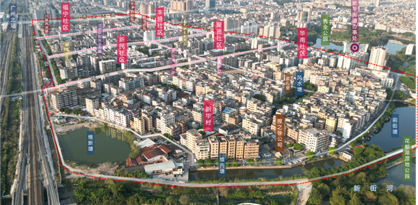 项目坐落于花都旧城核心、广州北站东侧,总用地面积71.4公顷,包含126个老旧小区,共8002户、2.29万人。新华老城区最具人间烟火气的新中路贯穿南北,两侧分布着太子步行街、新华市场、1958影院等老花都便民设施,然而片区却面临着基础设施缺乏、便民设施落后等问题,街区文化逐渐凋零,亟待振兴。