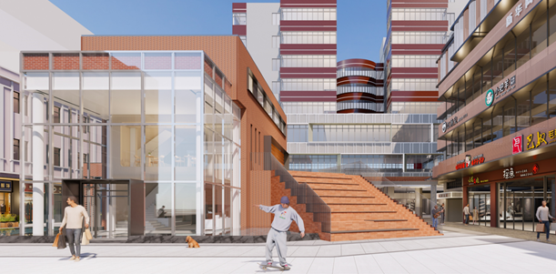 提炼在地元素,建立街区“基因库”,用新材料工艺延续历史印记。充分运用水磨石、红砖、花格窗等具有花都年代特征的建筑材料和构件,融入建筑本体改造,以集群街1号为例,通过腾退公房、拆旧建新等措施复建为3层党群中心。建筑本体采用红砖结合花格窗的元素进行设计,还原片区特色红砖建筑风貌,腾退的基底空间为附近居民提供活动休闲场地,让党群中心变成社区和居民之间沟通的“联结点”,让建筑成为场地与居民心中回忆的“交织点”。